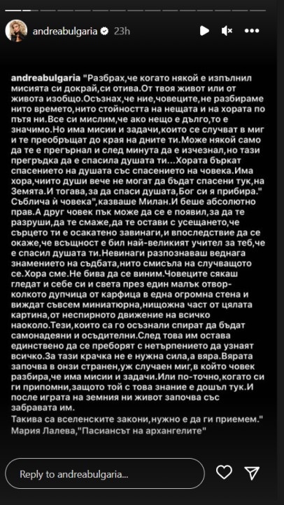 "Разбрах, че когато някой си е изпълнил мисията докрай, си отива. От твоя живот или от живота изобщо. Осъзнах, че човеците не разбираме нито времето, нито стойността на нещата и на хората по пътя ни. Все си мислим, че ако едно нещо е дълго, то е значимо. Но има мисии и задачи, които се случват в миг и те преобръщат до края на дните ти", гласят малка част от думите, които е споделила Андреа.