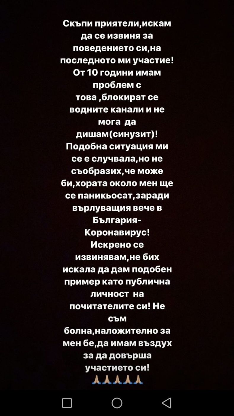 "От 10 години имам проблем с това, блокират се водните канали и не мога да дишам. подобна ситуация ми се е случвала, но не съобразих, че може би хората около мен ще се паникьосан, заради върлуващия в България коронавирус. Искрено се извинявам, не бих искала да дам подобен пример като публична личност на почитателите си. Не съм болна, наложително за мен бе да имам въздух, за да довърша участието си", гласи публикацията на певицата.