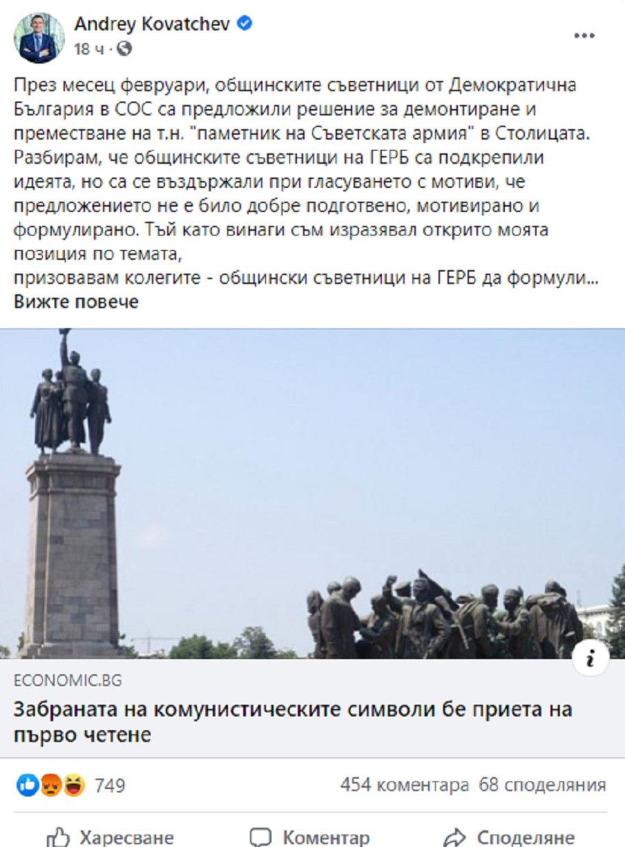 "През месец февруари, общинските съветници от Демократична България в СОС са предложили решение за демонтиране и преместване на т.н. "паметник на Съветската армия" в Столицата. Разбирам, че общинските съветници на ГЕРБ са подкрепили идеята, но са се въздържали при гласуването с мотиви, че предложението не е било добре подготвено, мотивирано и формулирано. Тъй като винаги съм изразявал открито моята позиция по темата, призовавам колегите - общински съветници на ГЕРБ да формулират, подготвят, внесат и гласуват предложението и да се сложи край на тази тема! Не може паметник в прослава на една окупаторска армия и олицетворяващ една тоталитарна и антихуманна идеология, наложила с насилие един престъпен режим, да заема централно място в Столицата ни!