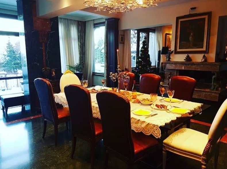 Те могат да излязат и в двора с много растителност през френските прозорци, които разкриват чудната гледка наоколо. За зимата басейнът е изпразнен. За разлика от къта за отдих с мека мебел и телевизор, трапезарията на Анелия е с голяма маса за хранене в близост до каменната камина.