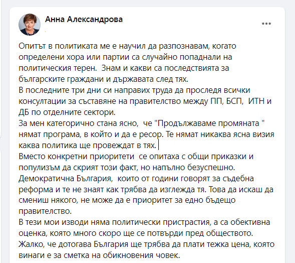 В последните три дни си направих труда да проследя всички консултации за съставяне на правителство между ПП, БСП, ИТН и ДБ по отделните сектори. Това заявява на страницата си във Фейсбук бившата шефка на правната комисия в НС Анна Александрова, коментирайки широко (само)рекламираните "открити" преговори по политики на ПП с евентуалните им коалиционни партньори.