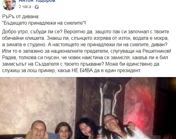 "А настоящето не принадлежи ли на смелите, диван? Или то е запазено за националните предатели, слугуващи на Решетников!". Това написа на страницата си във Фейсбук политологът Антон Тодоров, коментирайки думите на Радев от сутрешното му слово по повод празника, че бъдещето принадлежи на смелите.