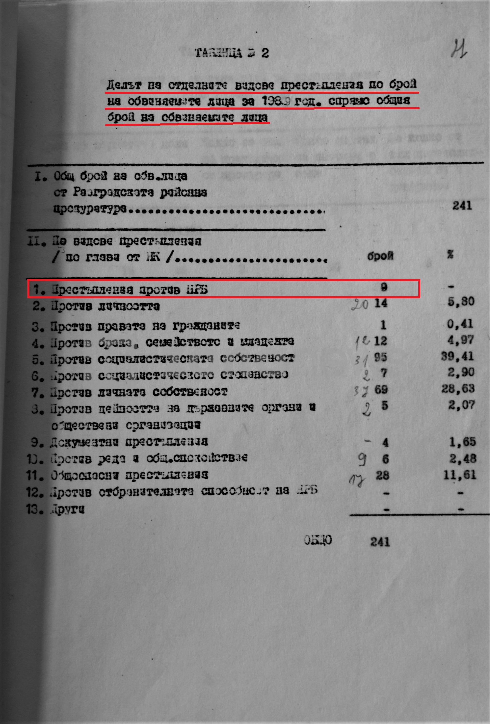 През 1989 г. Районна прокуратура-Разград е завела 9 (девет) обвинения на лица за престъпления против НРБ