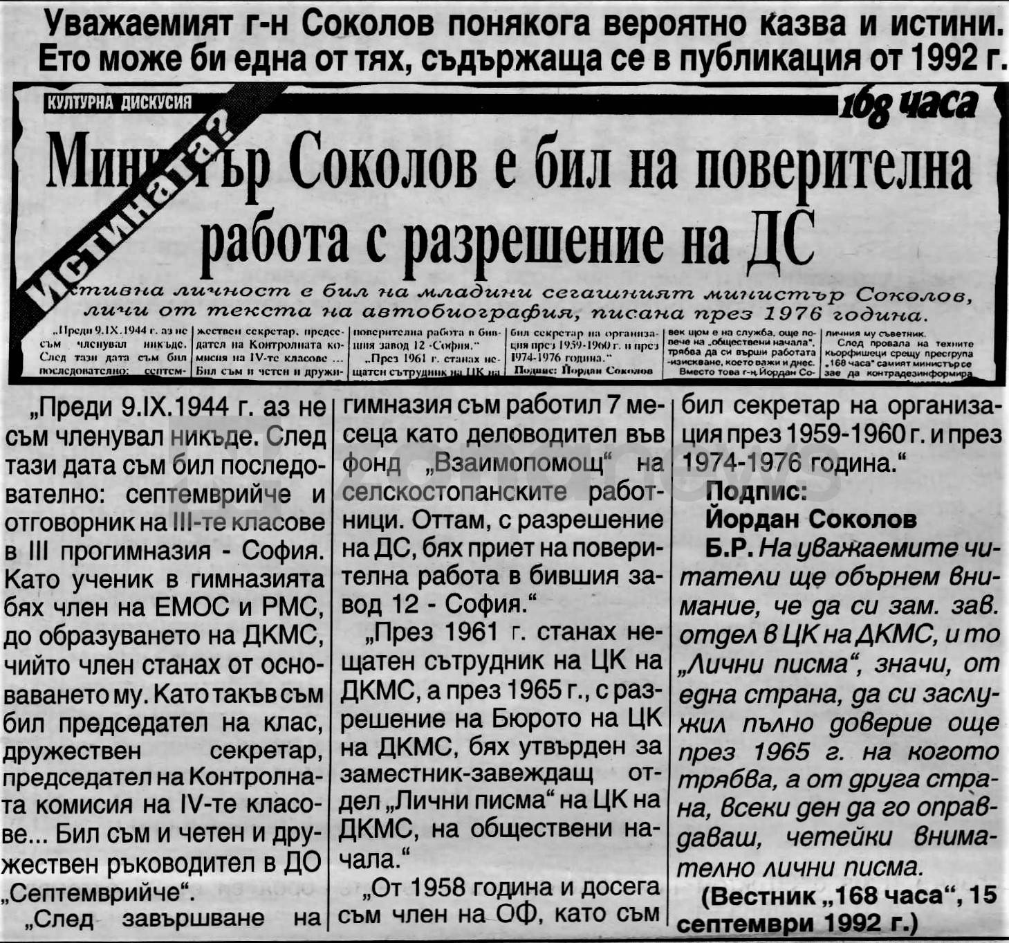 Соколов признава в автобиография, че е бил на поверителна работа с разрешението на Държавна сигурност