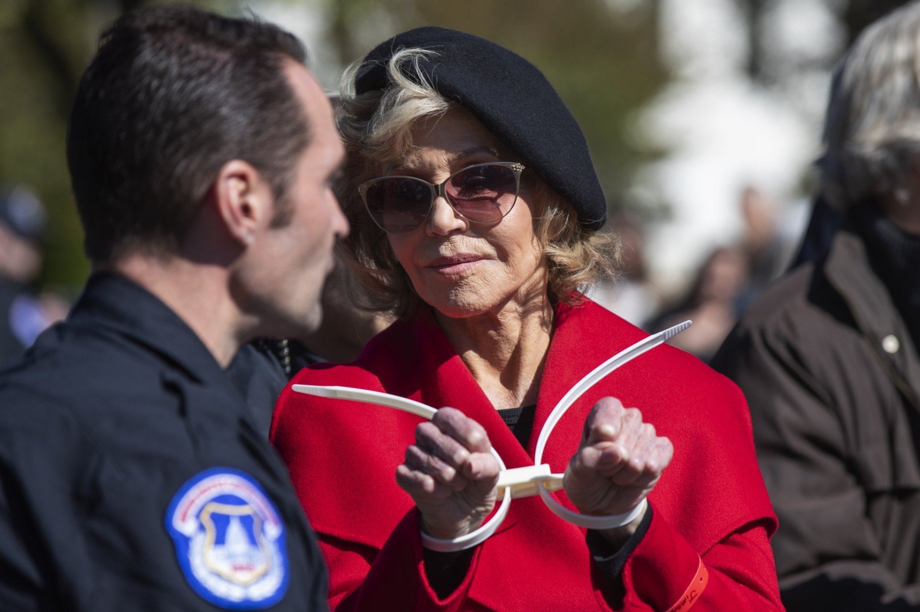 Заедно със звездата от сериала "Бар Наздраве" и още около 30 протестиращи, тя беше прибрана от полицията за смущаване на обществения ред и възпрепятстване на трафика. Джейн Фонда каза, че няма да се откаже от протестите. Тя се включва в подобни демонстрации всеки петък и твърди, че е дошло време да осъзнаем, че дома ни гори.