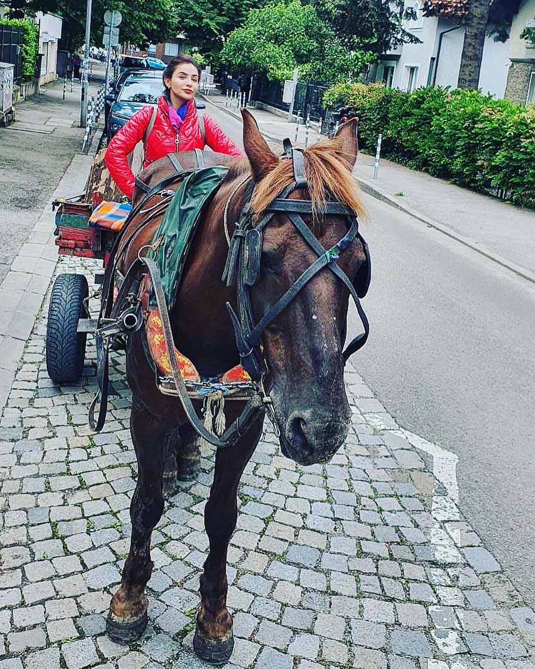 Звездата, която в последно време се практикува и като лечител по космеенергетика, се качи върху каруца. И не, снимката не е колаж, а става дума за истинско превозно средство, теглене от кон. В случая - ок кончето Мечо.