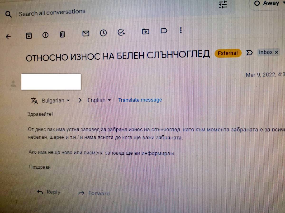 С устна заповед на министъра на финансите Асен Василев спрели износа на слънчоглед от България, но това създавало проблем за десетки експортни фирми в цялата страна, които не можели да изпълнят поръчките на своите контрагенти, както и да им обяснят адекватно причината за това. От бранша са категорични, че бизнесът им е пред колапс и настояват да бъде издаден писмен документ, който те да могат да предоставят на своите клиенти като основание за неизпълнение на поръчките им.