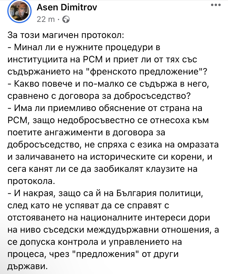- Има ли приемливо обяснение от страна на РСМ, защо недобросъвестно се отнесоха към поетите ангажименти в договора за добросъседство, не спряха с езика на омразата и заличаването на историческите си корени, и сега канят ли се да заобикалят клаузите на протокола.