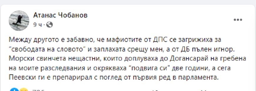 Между другото е забавно, че мафиотите от ДПС се загрижиха за “свободата на словото” и заплахата срещу мен, а от ДБ пълен игнор. Морски свинчета нещастни, които доплуваха до Догансарай на гребена на моите разследвания и окрякваха “подвига си” две години, а сега Пеевски ги е препарирал с поглед от първия ред в парламента.