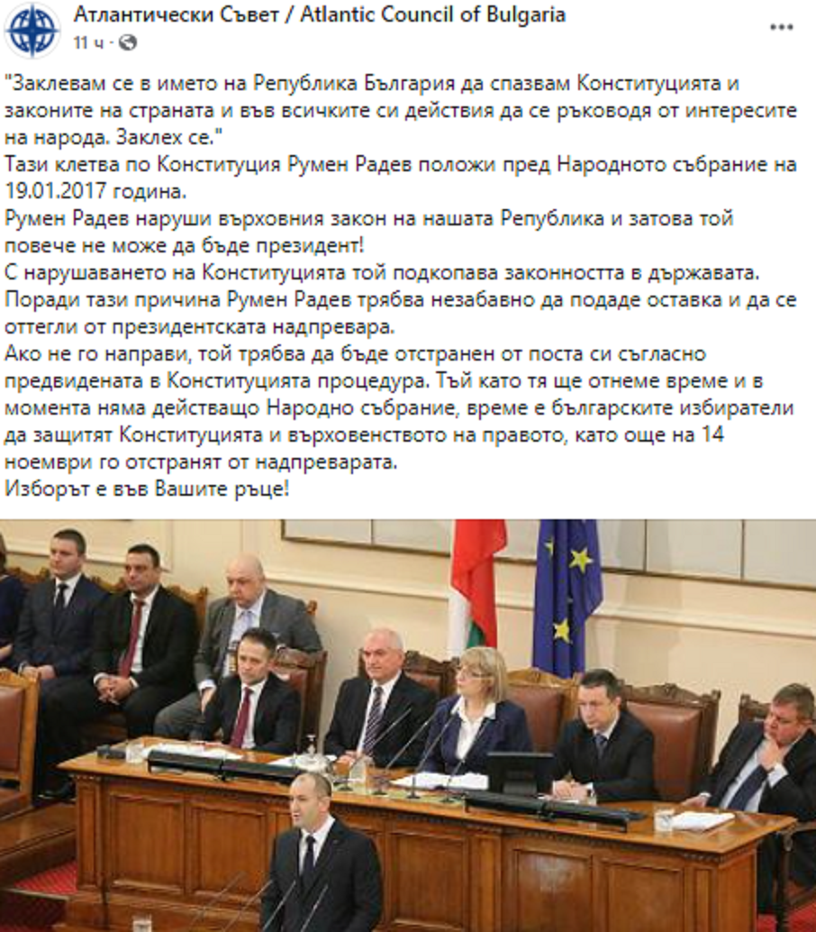Румен Радев трябва незабавно да подаде оставка и да се оттегли от президентската надпревара. Това призовават чрез Фейсбук от Атлантическия съвет.
