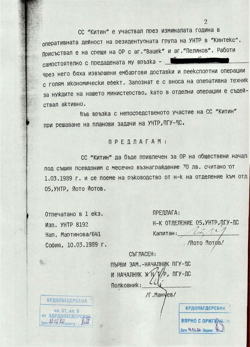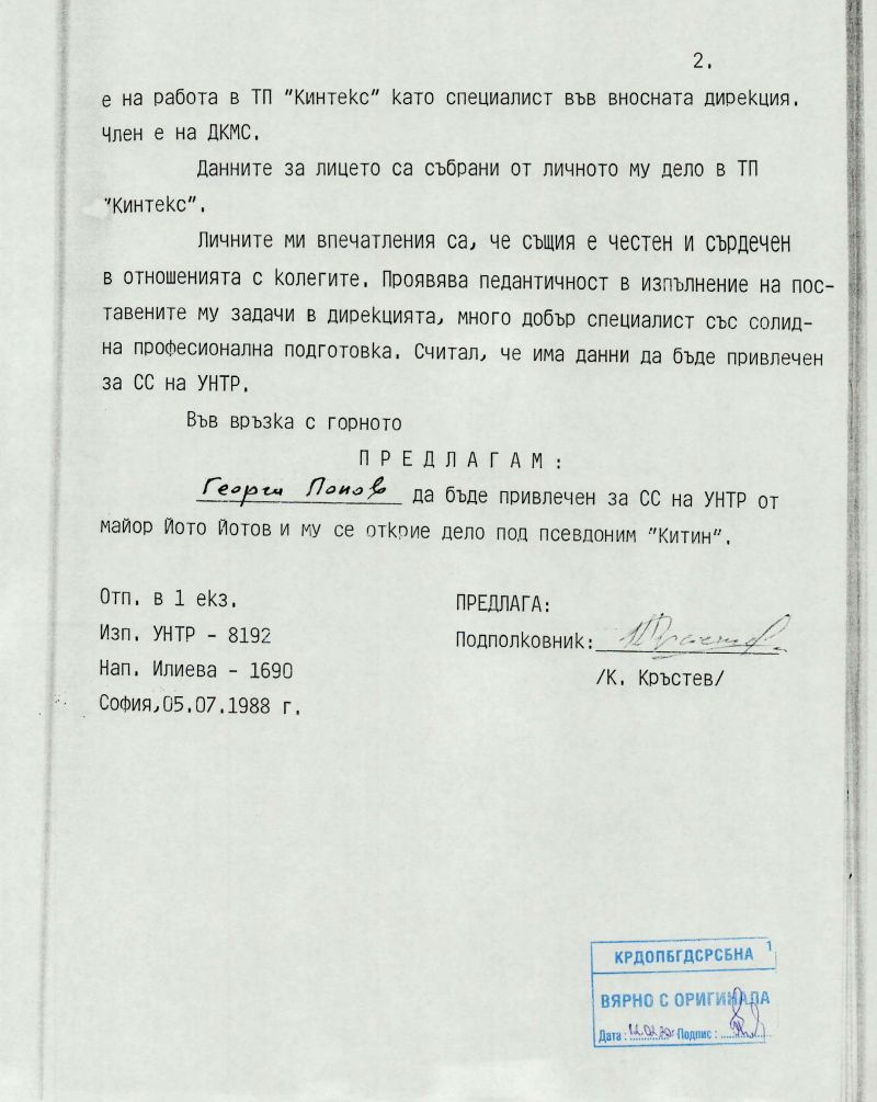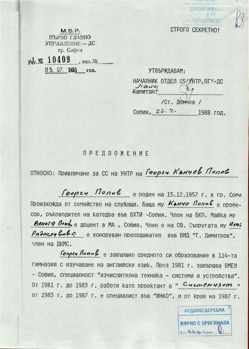 Попов е бивш секретен сътрудник на отдел 05 на Управлението за научно-техническото разузнаване към Първо главно управление на Държавна сигурност. От 1983 г. до 1987 г. е специалист в „ИНКО“, а от края на 1987 г. е на работа в „Кинтекс“ като специалист вносна дирекция, където е изградил добри контакти и закалка за предстоящия период на прехода. Вербуван е през юли 1988 г. от майор Йото Йотов за секретен сътрудник под псевдоним „Китин“, а от март 1989 г. е привлечен за оперативен работник на обществени начала. Незабавно е включен в една от най-секретните и под прекия контрол на КГБ програма за заобикаляне на западното ембарго срещу държавите от Източния блок – тази за доставката на ембаргово оборудване в областта на електрониката, военната и специалната техника. „Китин“ е участвал активно в оперативната дейност на резидентурната група на УНТР-ПГУ-ДС в ТП „Кинтекс“ Присъствал е на срещи с особено важни агенти с псевдоними „Вацек“ и „Пелинов“, работи самостоятелно с предадената му връзка Алън Симънс. Тримата се занимават основно с доставката през австрийски и швейцарски фирми на ембаргова електроника и оборудване за Съветския съюз.