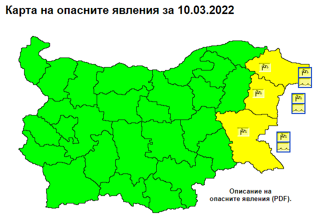 Над Черноморието облачността ще е променлива, след обяд по-често значителна и на отделни места по южното крайбрежие ще превали слаб сняг. Ще духа умерен, временно силен североизточен вятър. Максималните температури ще са 2-3 градуса. Температурата на морската вода е 5-6 градуса. Вълнението на морето ще се усили и ще бъде 3-4 бала.