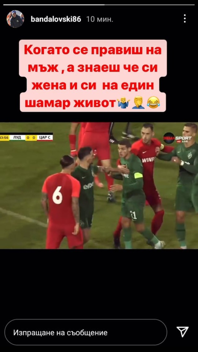 След мача, който завърши с победа за "Лудогорец" с 4:0, Бандаловски публикува ситуацията в своя профил в социалните мрежи и добави: „Когато се правиш на мъж, а знаеш че си жена на един шамар живот“.