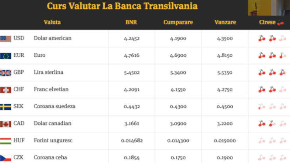 Така от таблицата с валутните курсове на банката става ясно, че един американски долар се продава за 4,3 леи или две череши, а едно евро - за 4,8 леи или две череши и половина. За една шведска крона (0,4 леи) обаче можеш само да докоснеш черешата, съобщи Медиафакс.