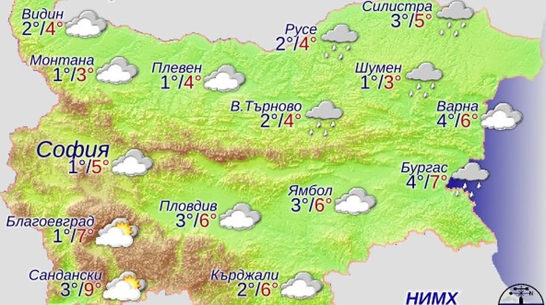 Ще се задържи облачно и мъгливо, на места - с ръмежи. Временни разкъсвания на облачността ще има след обяд над Югозападна България. Очаква се почти тихо време, с минимални температури между 0 и 5 градуса и максимални - между 2 и 7 градуса, в крайните югозападни райони - до 9 – 10 градуса, съобщават от Националния институт по метеорология и хидрология (НИМХ), цитирани от „Фокус”.
