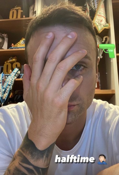 Явно очаквал победа за бившия си отбор, Бербатов бе крайно разочарован на почивката. Ливърпул вкара четири безответни гола през първото полувреме, а това накара бившия нападател да се хване за главата…