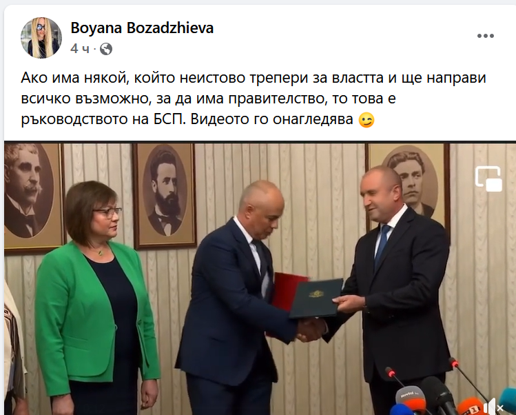 Бившата пиарка на БСП Бояна Бозаджиева, напъдена позорно от Корнелия Нинова, се изгаври със сръчността на баджанаците Румен Радев и Георги Свиленски при връчването на третия проучвателен мандат.