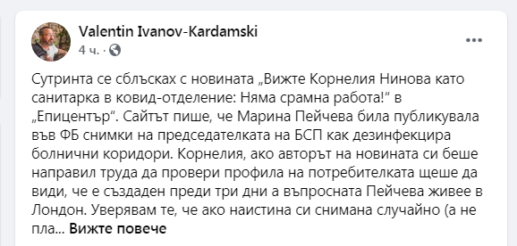 Сутринта се сблъсках с новината „Вижте Корнелия Нинова като санитарка в ковид-отделение: Няма срамна работа!“ в „Епицентър“. Сайтът пише, че Марина Пейчева била публикувала във ФБ снимки на председателката на БСП как дезинфекцира болнични коридори. Корнелия, ако авторът на новината си беше направил труда да провери профила на потребителката щеше да види, че е създаден преди три дни а въпросната Пейчева живее в Лондон. Уверявам те, че ако наистина си снимана случайно (а не планирано), то вероятността снимките ти да бъдат изпратени най-напред на живеещо в Лондон момиче с открит току-що профил, а тя да ги публикува точно пък във ФБ групата „АЗ ПОДКРЕПЯМ КОРНЕЛИЯ НИНОВА“ е пренебрежимо малка. Това коментира на страницата си във Фейсбук бившият пиар на червената лидерка Валентин Иванов-Кардамски.