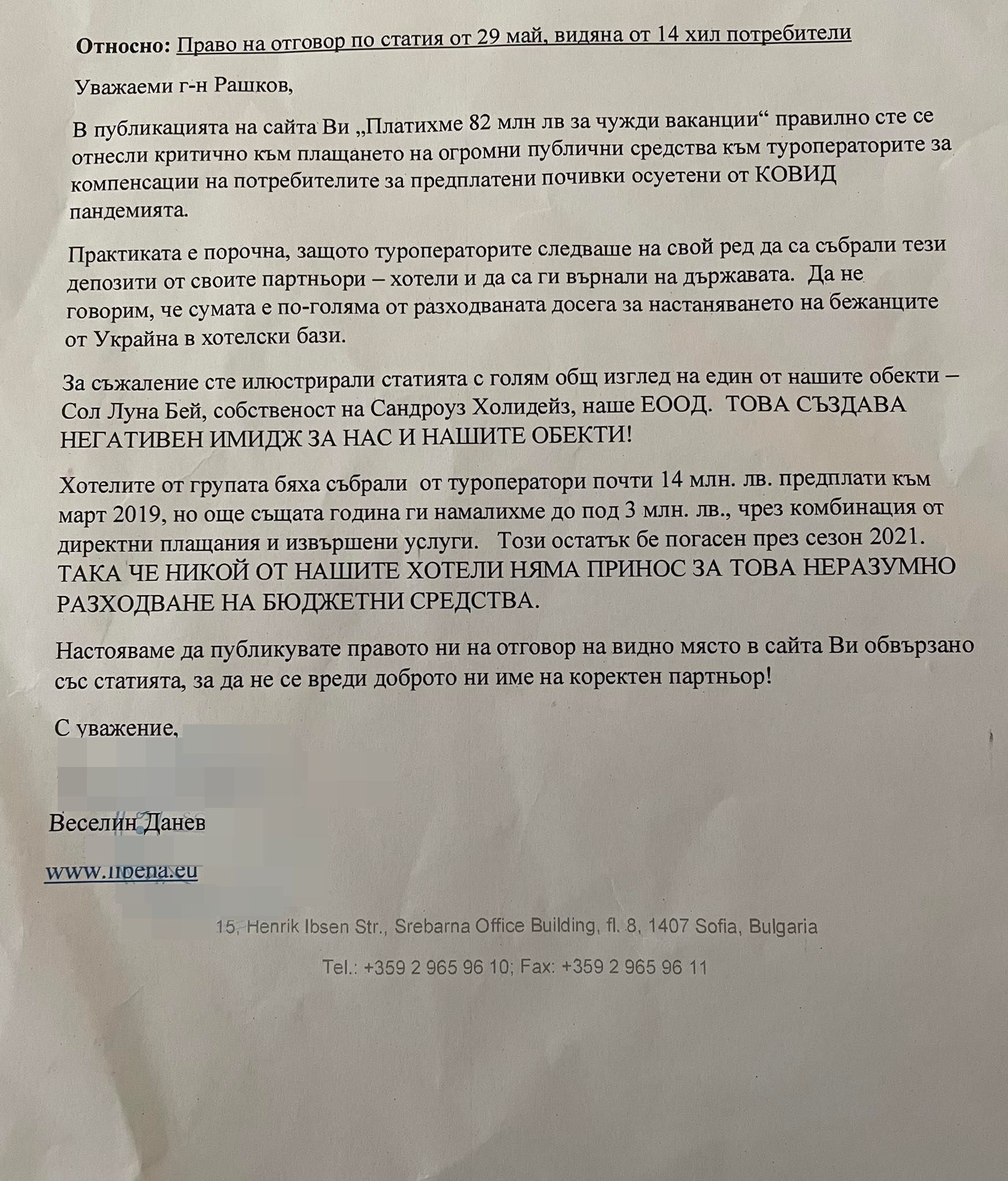 Става дума за материал на медията ни "Платихме 82 млн. лв. за чужди ваканции", илюстриран с един от хотелите, управлявани от Данев. В писмото си до ПИК той потвърждава написаното за изплатения огромен размер на публични средства към туроператорите, но твърди, че хотелите, управлявани от "Либерта Ризортс"", нямат общо с тази практика и още през 2021 г. са изплатили всички предплати в размер на 14 млн. лв.