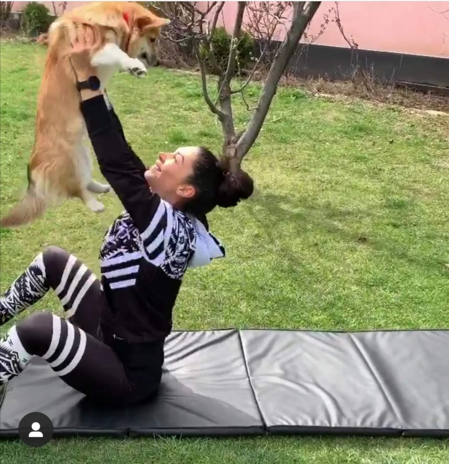 В днешните упражнения Йотовска си имаше асистент - кучето й Мери-Роуз, видя ПИК. Симпатичното корги изпълняваше функцията на тежести и видимо се забавляваше със стопанката си.