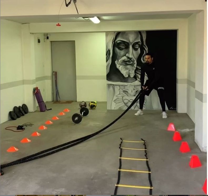 С това се похвали самият той в Инстаграм, където пусна и видео от своя тренировка. Въжета, конуси, тежести - това са само част от нещата, които е натрупал в дома си спортистът.