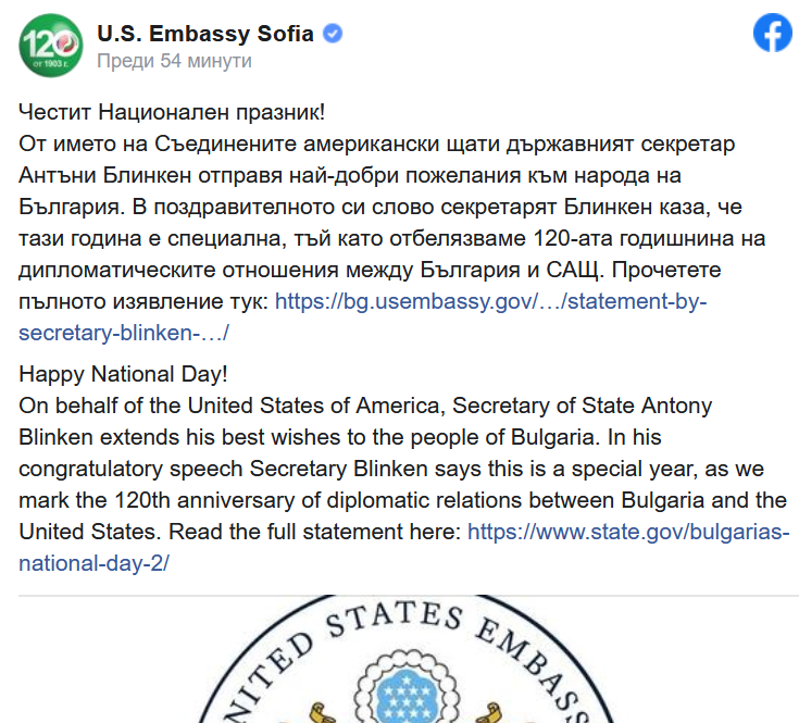 Той отбелязва, че тази година е от специално значение, защото се отбелязва 120-ата годишнина на дипломатическите отношения между България и САЩ. „През годините нашето приятелство прерасна в многостранно партньорство. Като приятели, партньори и съюзници в НАТО, ние се гордеем със своите споделени ценности и работим съвместно, за да гарантираме мир, сигурност и просперитет за народите си. Знайте, че ние стоим рамо до рамо с вас и вашите съседи, докато се изправяме срещу трудностите, причинени от непровокираната война на Русия срещу Украйна”, допълва Блинкен.