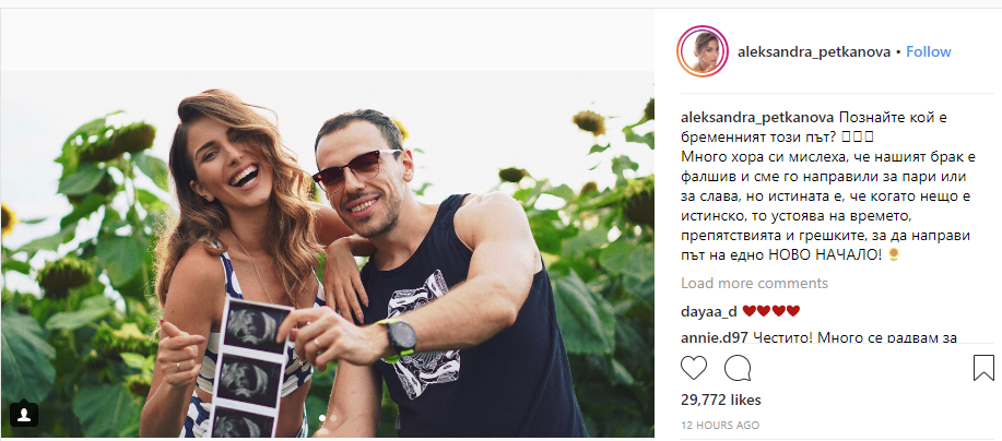 "Познайте кой е бременният този път? Много хора си мислеха, че нашият брак е фалшив и сме го направили за пари или за слава, но истината е, че когато нещо е истинско то устоява на времето, препятствията и грешките, за да направи път на едно НОВО НАЧАЛО!", написа Богднаска- Петканова като коментар към снимката.
