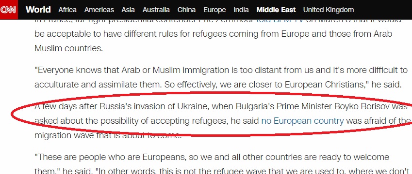Всъщност CNN са сложили думи на премиера Кирил Петков в устата на Борисов. Петков посочи, че сега идват бежанци от Украйна, които са образовани и са европейци, и които не са като другите. „Това не са бежанците, с които сме свикнали. Както каза австрийският канцлер, това са наши роднини, семейство. Това са европейци, интелигентни, образовани хора, част от тях са програмисти. Ние, както и всички други сме готови да ги посрещнем. Това не е обичайната бежанска вълна от хора с неясно минало. Никоя от европейските страни не се притеснява от тях“, каза Петков. Думите му предизвикаха вълна от недоволство и обвинения в расизъм.