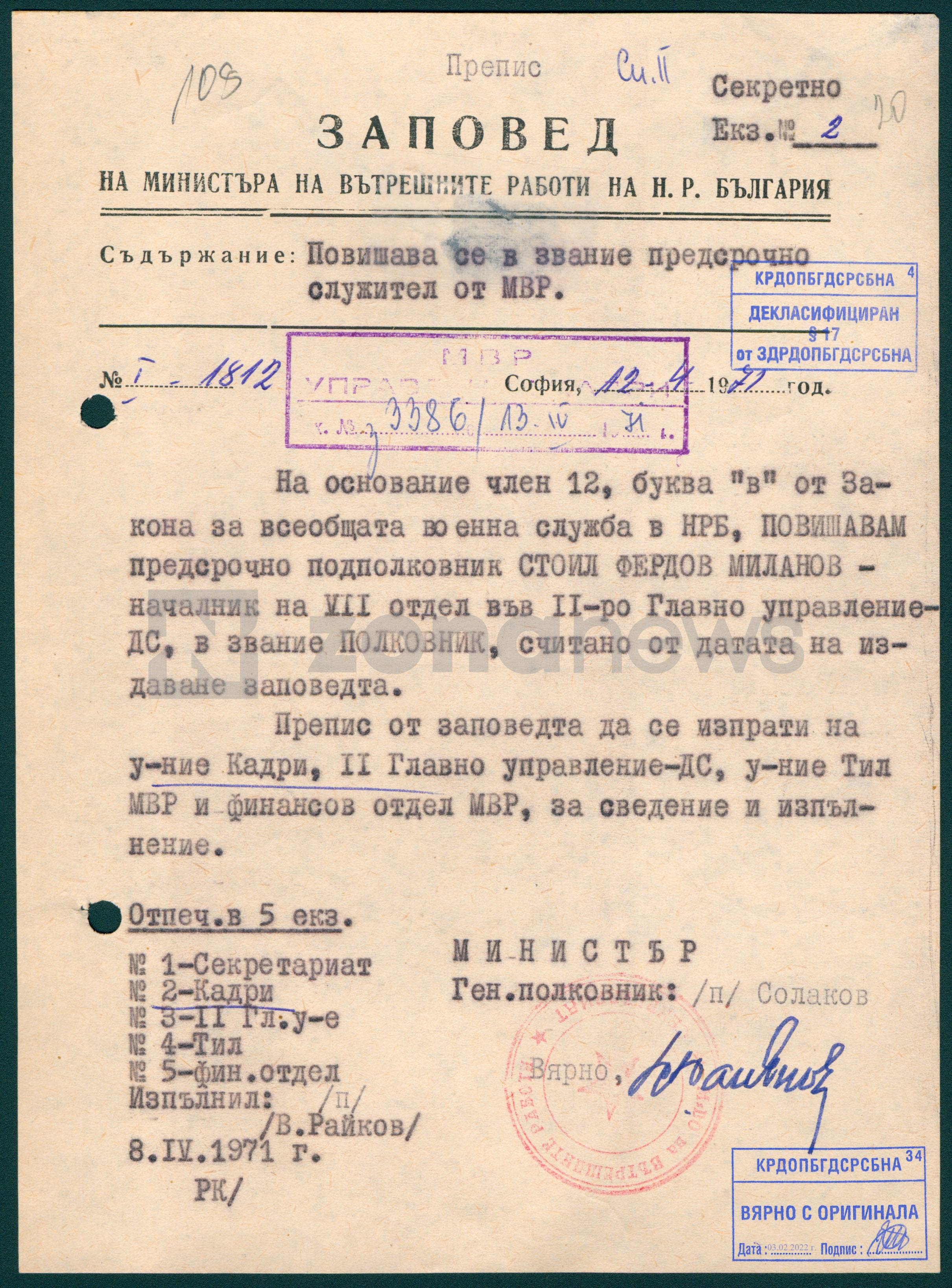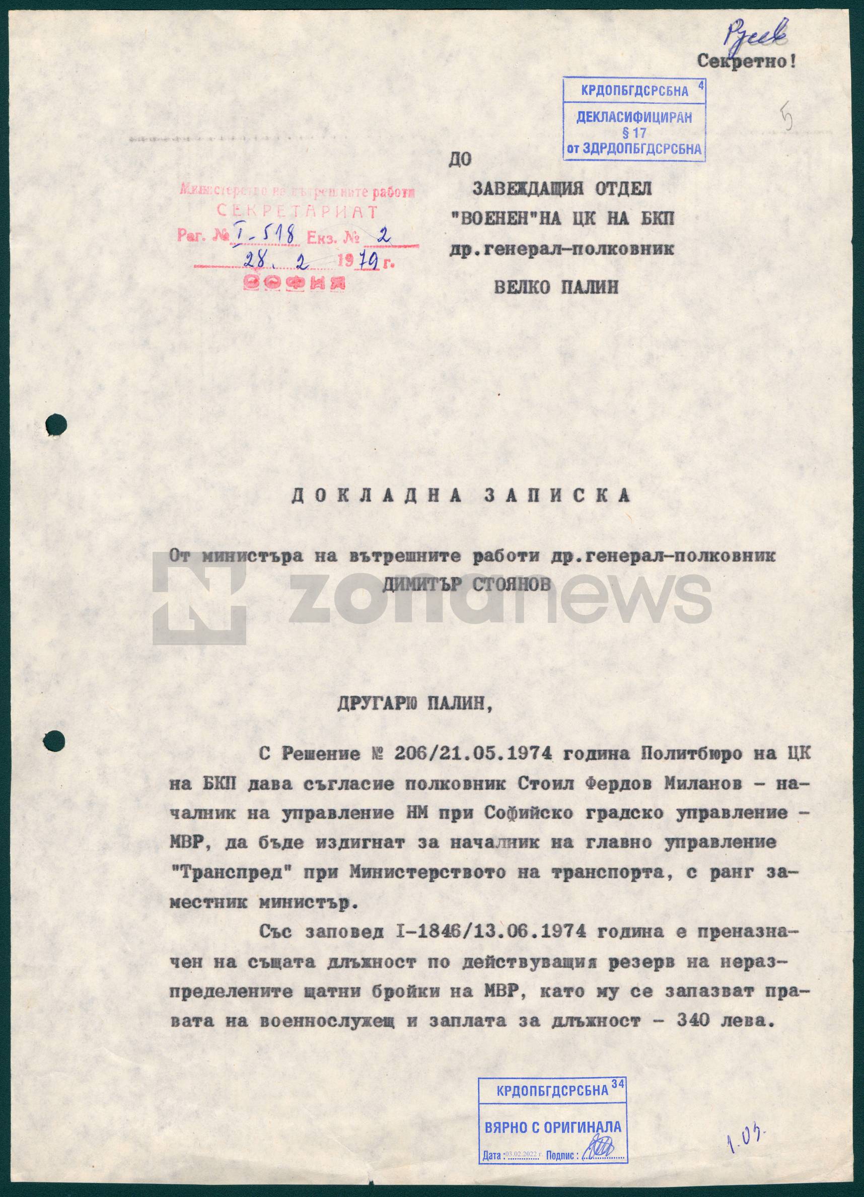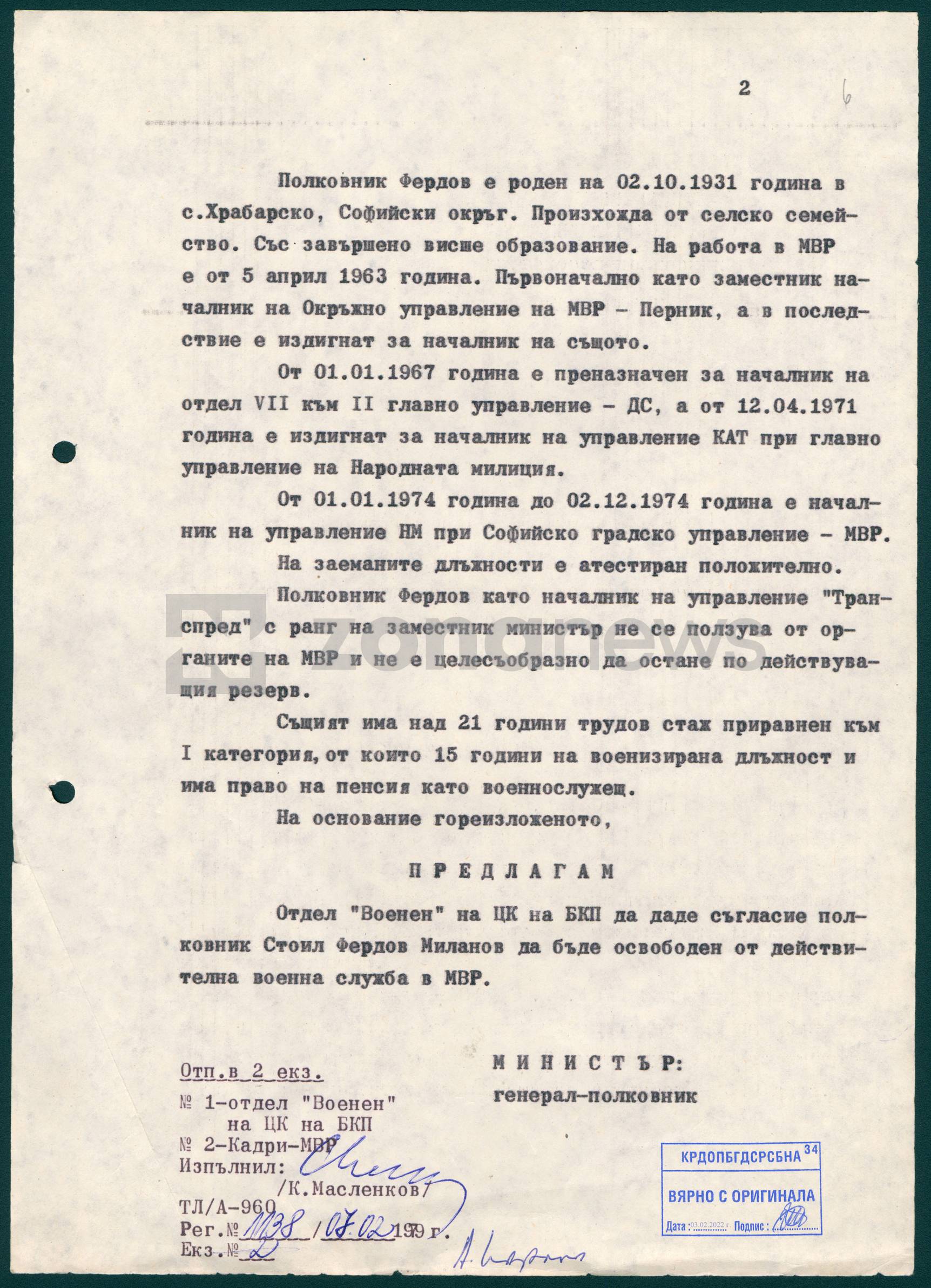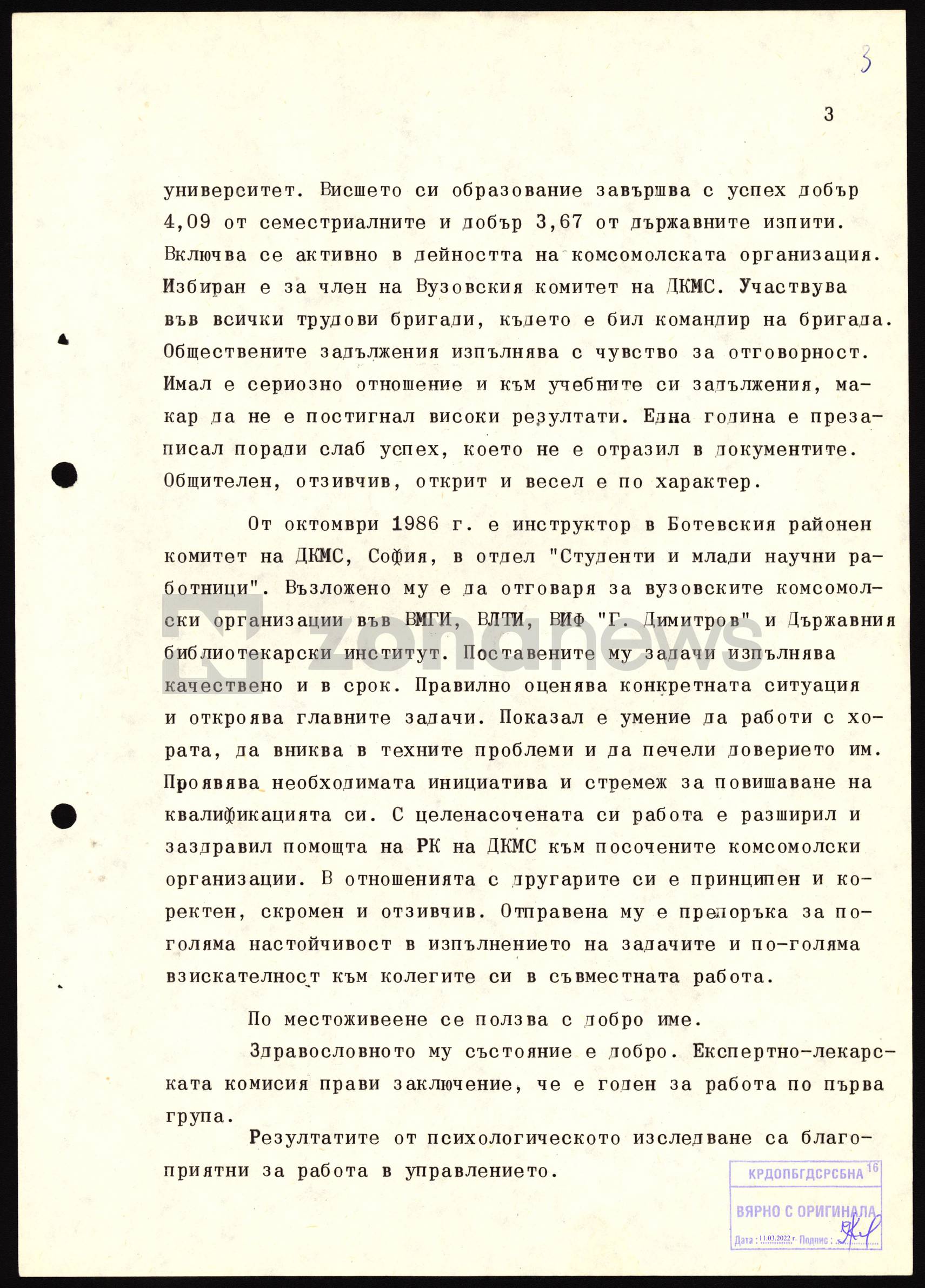 "Кандидатът се насочва към МВР в резултат на дълбока и трайна мотивация, след придобиването на специалност и известен трудов опит. Водещите мотиви произтичат от разбирането му за идеологическия по своята същност характер на дейността....Не се откроява с особени общоинтелектуални възможности, което заедно с възрастово обусловената неопитност, обяснява донякъде известна повърхностност, стандартност, несамостоятелност в анализите и оценките, които прави".