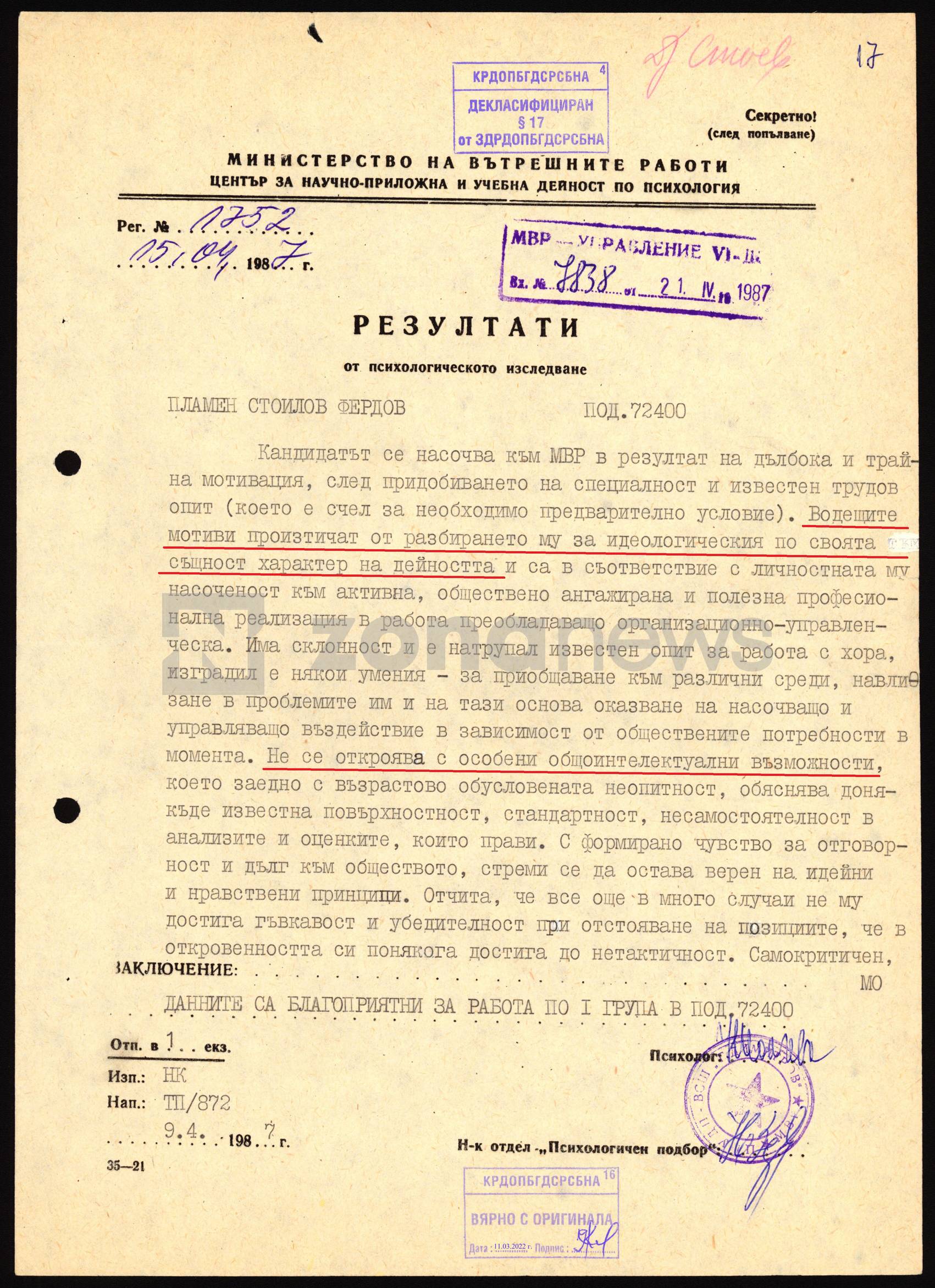 След като е извършено проучването му за работа в Държавна сигурност, от Център за научно-приложна и учебна дейност по психология на МВР представят резултатите от психологическото му изследване, където пише следното: