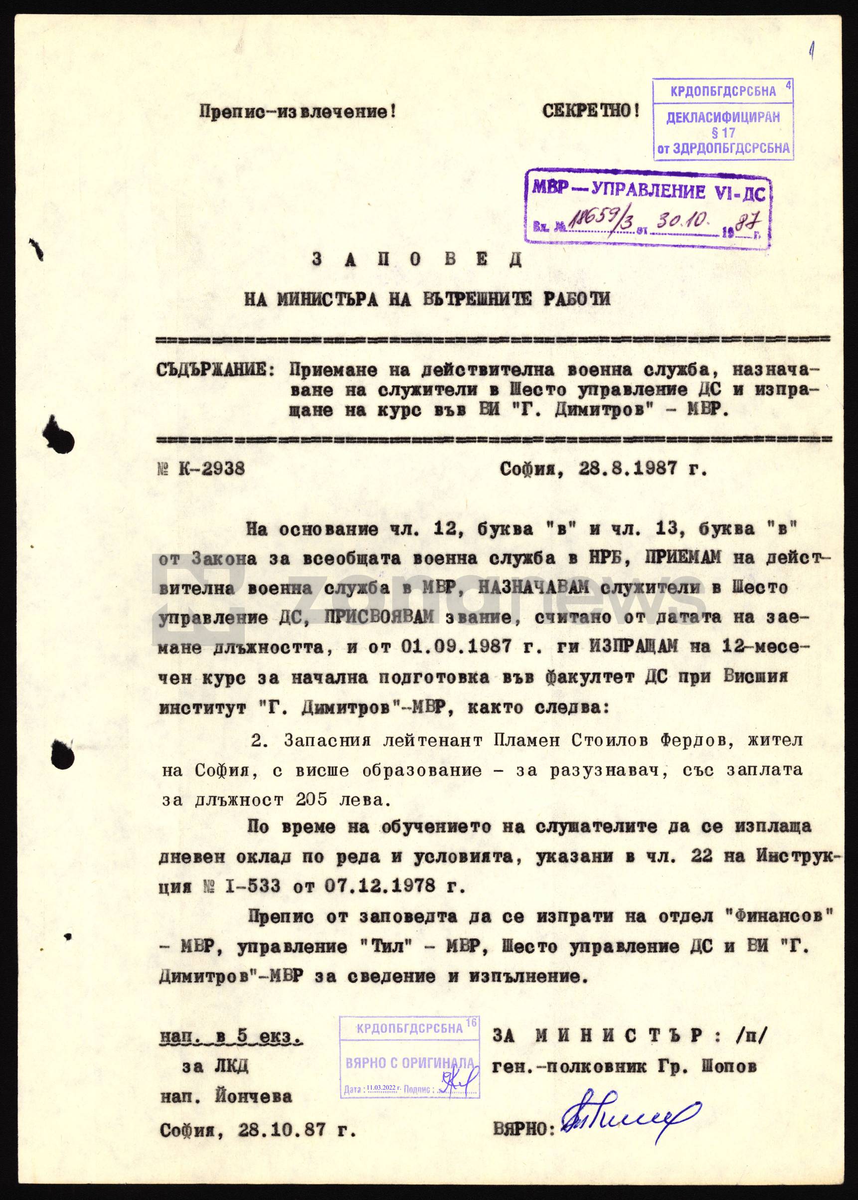 Държавна сигурност започва изучаването на Пламен Фердов през 1987 г. На 28 август с.г. проучването е завършено и е съставена т.н. "Справка-заключение". От нея разбираме, че Фердов е роден на 30.11.1961 г. в Перник. Завършил е през 1979 г. 7-мо ЕСПУ "Г. Димитров" в столицата успех 4,73!!! Запомнете този успех, той ще протече като червена нишка в заключението на психолозите от МВР преди да го приемат на работа в Шесто управление на ДС.