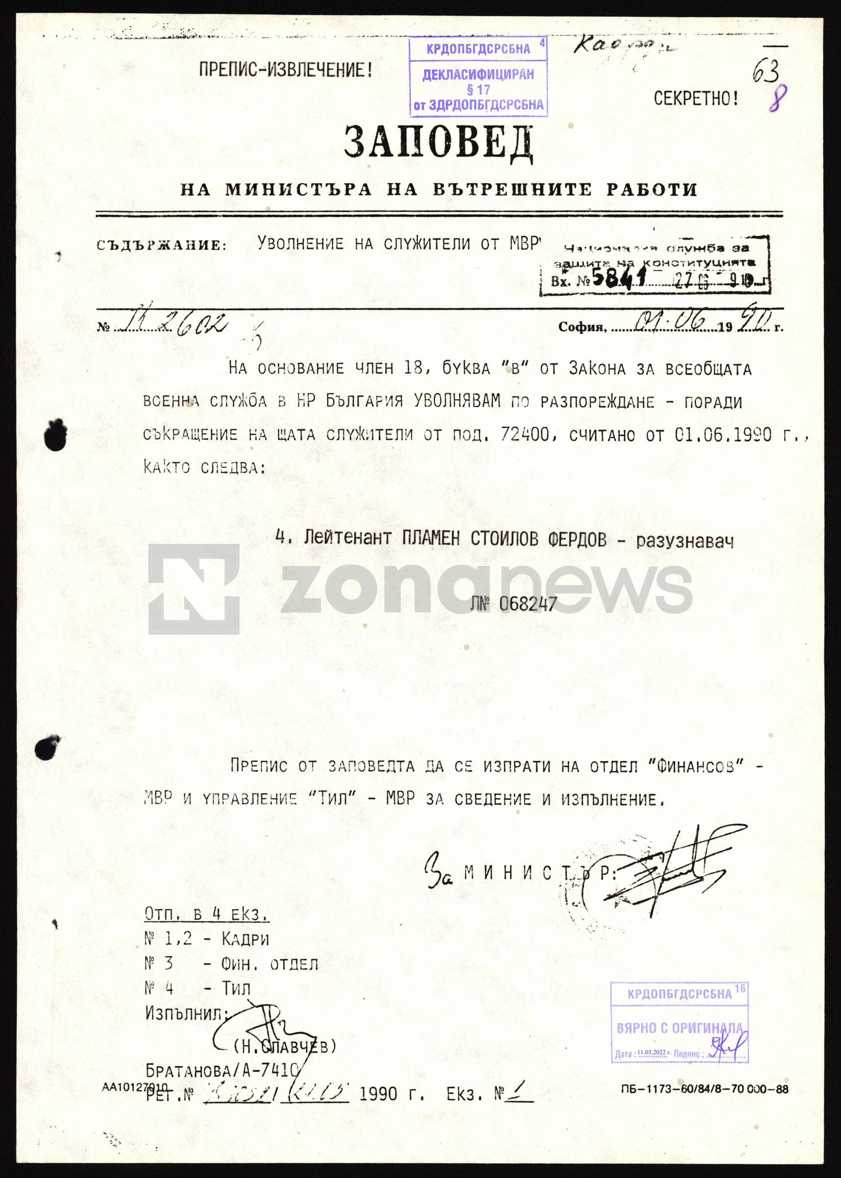 Пламен Фердов е уволнен на 1 юни 1990 г. поради съкращение на щата (разформироването на Шесто управление на ДС).