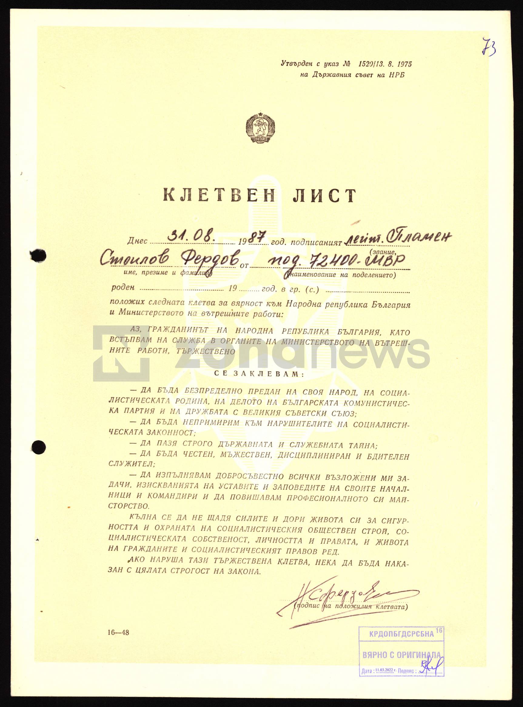 В клетвения си лист днешният съветник на Бойко Рашков се заклева да бъде "безпределно предан на делото на Българската комунистическа партия и на дружбата с великия Съветски съюз".