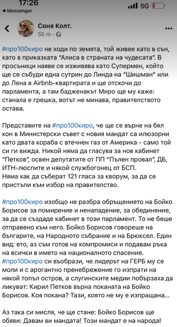 Представите на #про100киро, че ще се върне на бял кон в Министерски съвет с новия мандат са илюзорни като двата кораба с втечнен газ от Америка - само той си ги вижда. Никой няма да гласува за нов кабинет “Петков”, освен депутатите от ПП “Пълен провал”, ДБ, ИТН-люспите и някой службогонец от БСП.