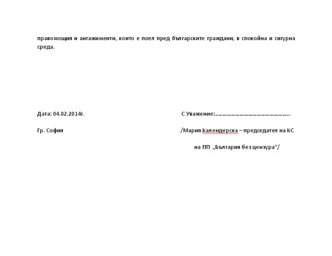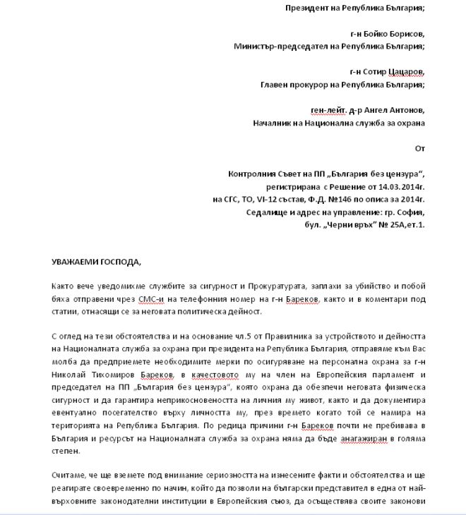 "През изминалите месеци председателят на ПП „България без цензура” и член на Европейския парламент господин Николай Бареков е подложен на многократни атаки, издевателства и обиди от множество анонимни и персонализирани източници в интернет пространството и медиите. Част от нападките са свързани със заплахи за физическа саморазправа, които целят разчистване на сметки. Имаме основателни причини да се съмняваме, че публичните изказвания на г-н Бареков, в които се дебатират политическите му отношения с Христо Ковачки, са провокирали поръчителство за посегателство върху личността на г-н Бареков. Ясен пример за това е публикацията в ежедневно издание, принадлежащо към голяма и реномирана медийна група, позоваваща се на собствен източник, а именно в-к „Всеки ден“ в броя от 03 февруари 2015 г., която прилагаме към настоящото писмо, със заглавие: „Плашат Бареков с побой”, в която недвусмислено се твърди, че според източници на изданието се планират „цензуриране с гьостерица”, „здрав кьотек” и „мариз”, се посочва в сигнала.