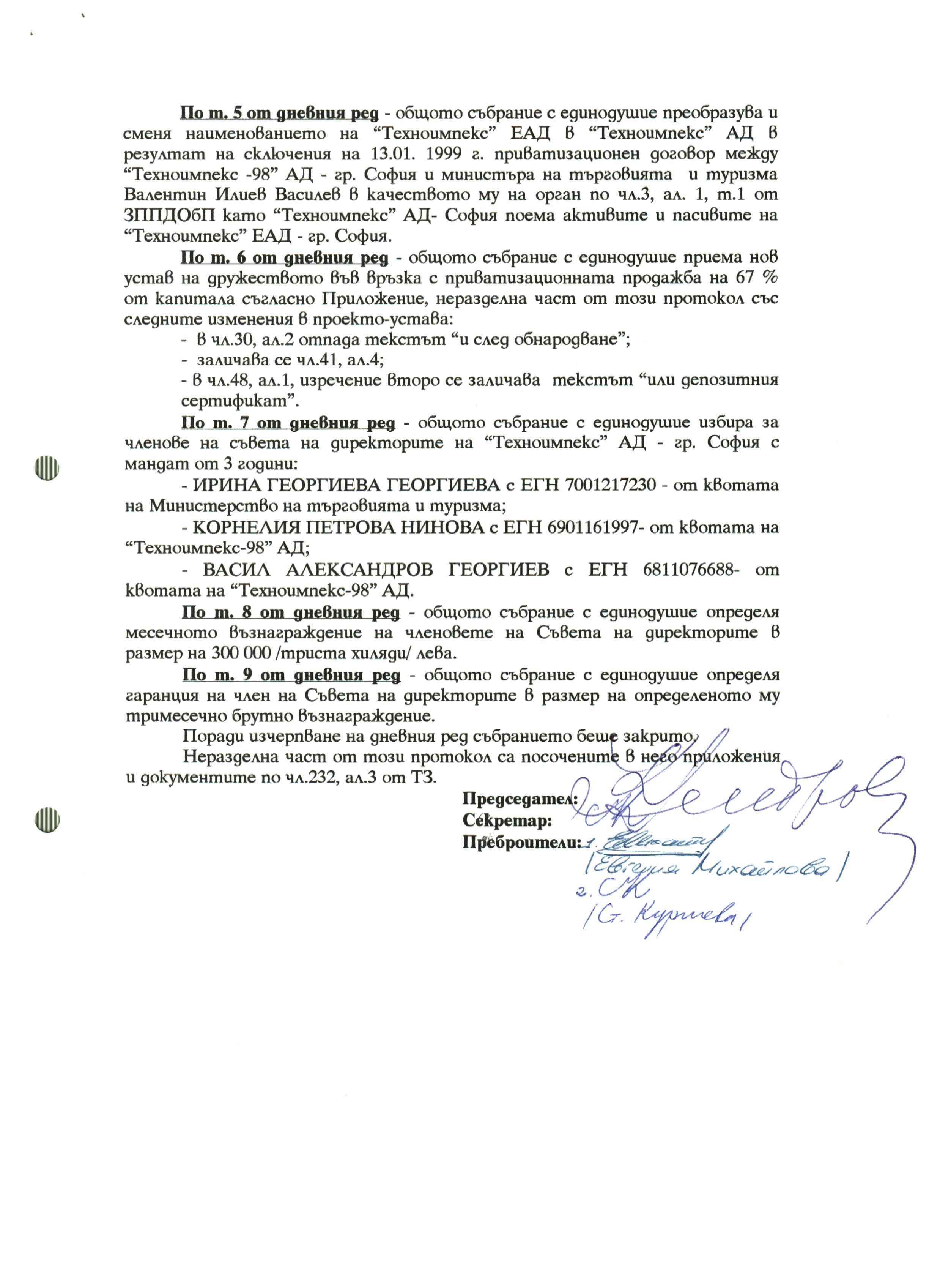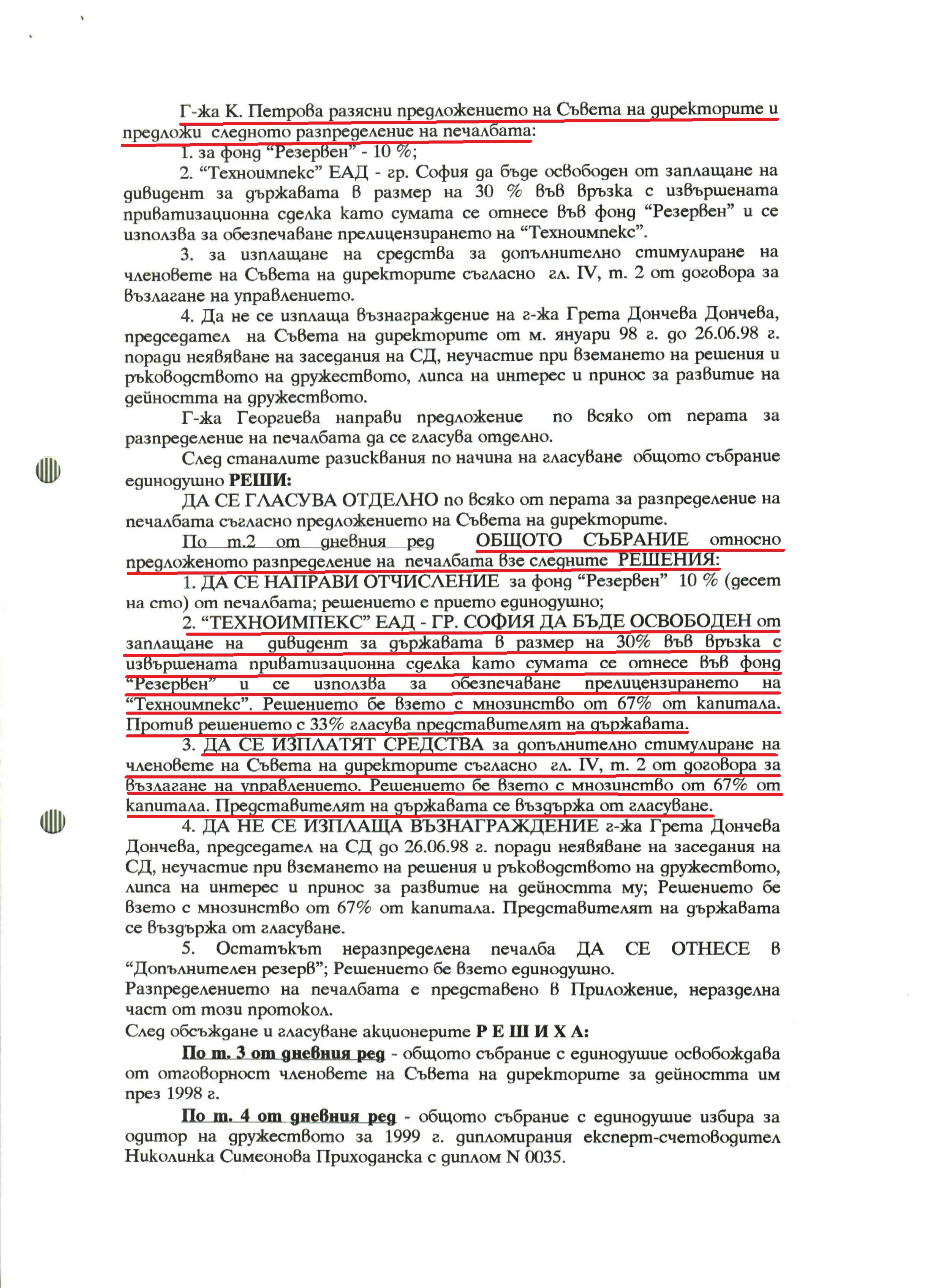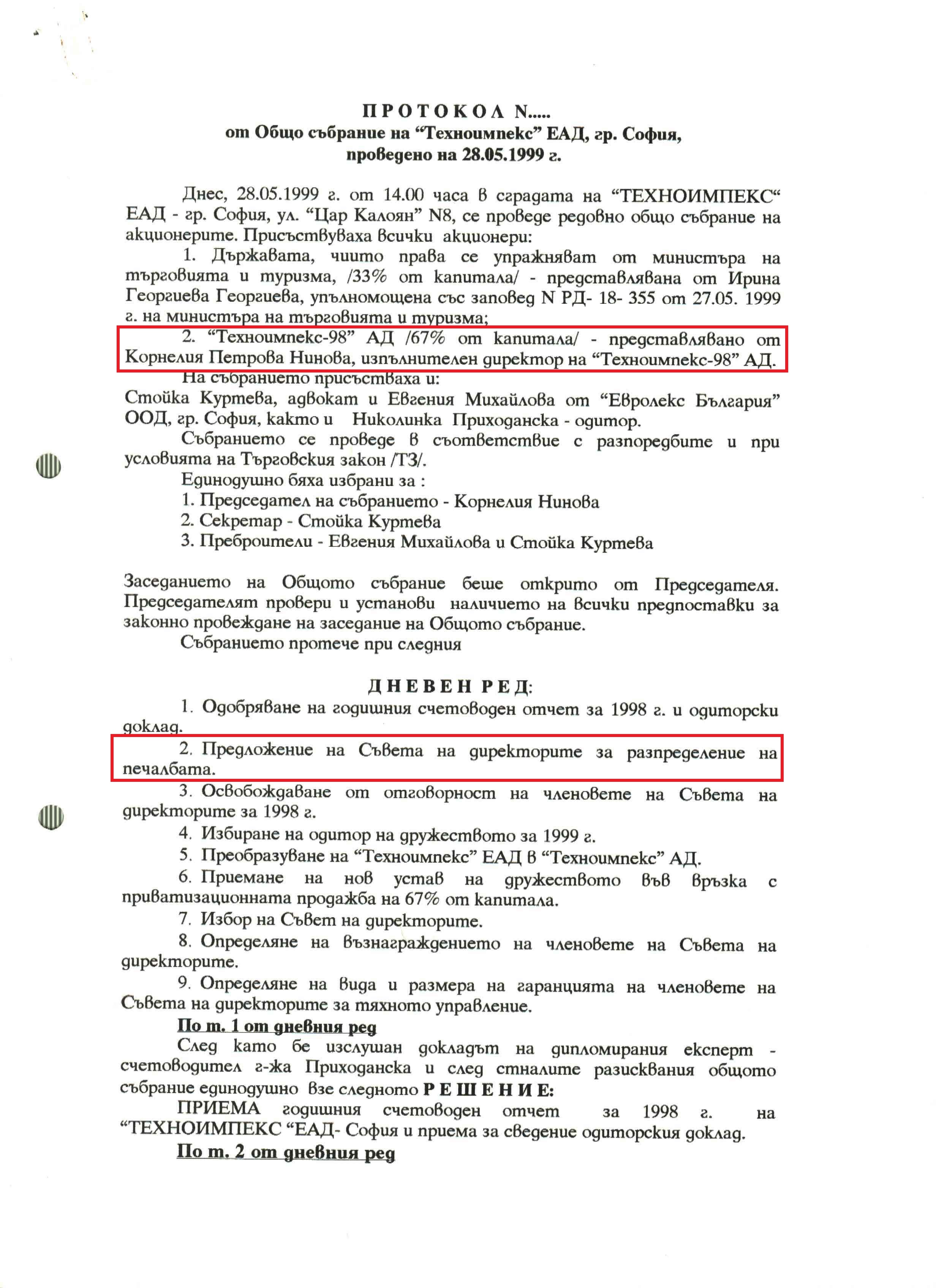 През късната пролет на 1999 г. идва време за разпределение на дивидента на прясно приваитзираното дружество. Нинова и сие притежават 67% него, държавата – 33%. Със Заповед № РД-18-355 от 27.05.1999 г. министърът на търговията и туризма тогава Валентин Василев разпорежда на представителя на държавата в Съвета на директорите на дружеството „Техноимпекс“ Ирина Георгиева да гласува „За“ по т. 2 от дневния ред на заседанието на Съвета на директорите. Точката касае разпределянето на печалбата на дружеството за 1998 г.