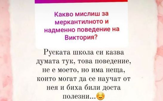На въпроса какво мисли за меркантилното поведение на Виктория Капитонова, тя определено не спести критиката си, като все пак запази добрия тон и дори завърши по положителен начин отговора си.