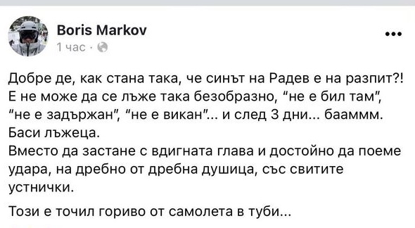 Е не може да се лъже така безобразно, “не е бил там”, “не е задържан”, “не е викан”... и след 3 дни... бааммм. Баси лъжеца. Така емоционално коментира на страницата си във Фейсбук бившият лидер на СДС Борис Марков, коментирайки разпита на сина на държавния ни глава днес в 4-то РПУ. От президентството се кълняха и отричаха наследникът на Радев да е замесен в пиянски купон в разгара на пандемията в столичен хостел. Истината обаче излезе наяве.