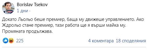 Цеков коментира и пръкналата се кандидатура на премиер на доскорошния парламентарен шеф Никола Минчев. "Докато Льольо беше премиер, баща му движеше управлението. Ако Ждрольо стане премиер, тази работа ще я върши майка му. Промяната продължава", пояснява той.