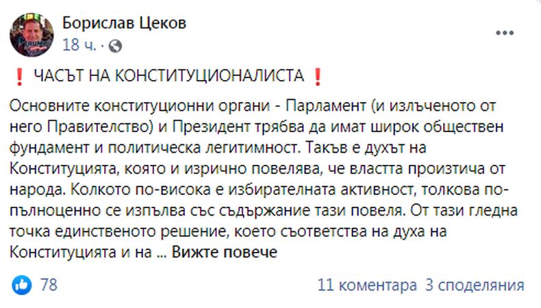 "Пенсиите на хората не са им важни. Важно им било кого ще охранява НСО. За такова скъсване с действителността от т.нар "партии на протеста" става дума. Когато живееш в собствения си фейсбук-балон и си въобразяваш, че това е "народът" и там е общественото мнение, се стига до такава политическа патология." Това написа в профила си във "Фейсбук" юристът Борислав Цеков. "Не експериментирайте с конституционната система, защото експериментите могат да родят политически чудовища", предупреди той.