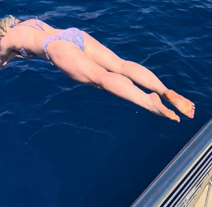 Тя публикува серия от фотоси, направени по време на първото ѝ пътуване с яхта. На две снимки певицата се показва топлес, като прикрива гърдите си с шапка и чиния с плодове. На другите две снимки певицата позира в бански костюм от две части с леопардов десен, състоящ се от корсаж с триъгълни чашки и бански с презрамки. В кадъра е заснет и скокът на Спиърс от лодката във водата, пише life.dir.bg.