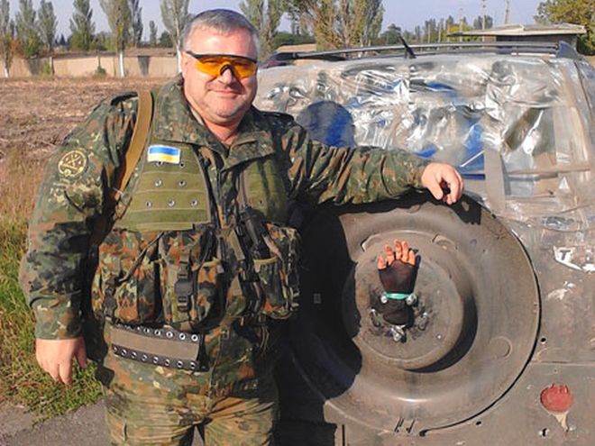 В мрежата се появи снимка на известния днепропетровски адвокат и боец от крайнонационалистическите военни формирования на Украйна Едмонд Саакян. Като радикалист от ИДИЛ той с удоволствие позира на фона на автомобил, към задната гума на който е залепена отсечената ръка на опълченец.