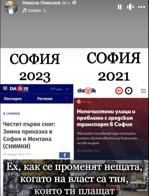 За брутална медийна манипулация сигнализира във фейсбук националният координатор на ГЕРБ Никола Николов, видя ПИК. Той публикува колаж от две снимки на две новини, свързани с първия сняг в София. И двата материала са публикувани в една и съща медия.