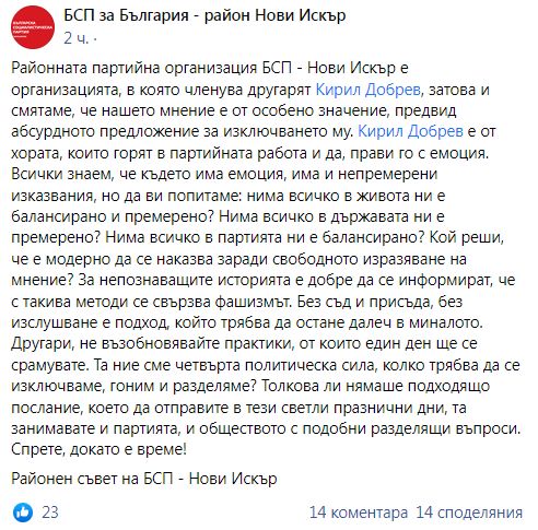 "Кой реши, че е модерно да се наказва заради свободното изразяване на мнение? За непознаващите историята е добре да се информират, че с такива методи се свързва фашизмът. Без съд и присъда, без изслушване е подход, който трябва да остане далеч в миналото. Другари, не възобновявайте практики, от които един ден ще се срамувате. " това пишат на страницата си във "Фейсбук" от БСП за България - район Нови Искър. Това е организацията, в която членува Кирил Добрев и поводът е искането на за неговото отстраняване.