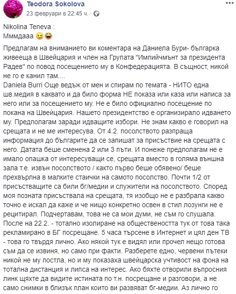 Червени пътеки никой не му постла, показаха му швейцарска учтивост на фона на тотална дистанция и липса на интерес", пише още българката, живееща в Швейцария по повод визитата на Радев.