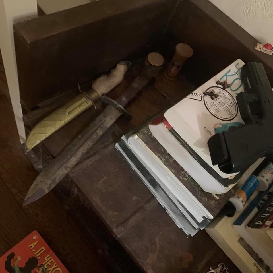 До главата си Слабаков е аранжирал има пистолет и два старинни ножа, както и книгата "Неприятностите са моят занаят" на Реймънд Чандлър заедно с томче на Чехов.