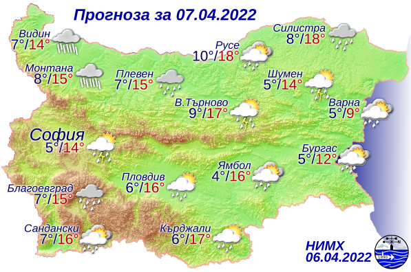 Започналото от запад увеличение на облачността през деня ще обхване цялата страна и на много места ще има краткотрайни валежи от дъжд, около и след обяд на места с гръмотевици. Ще духа слаб до умерен вятър, в Източна България от югоизток, в западната половина от страната отначало от югозапад, след обяд от северозапад. Максималните температури ще бъдат между 13 и 18 градуса, по-ниски по Черноморието, в София - около 14.
