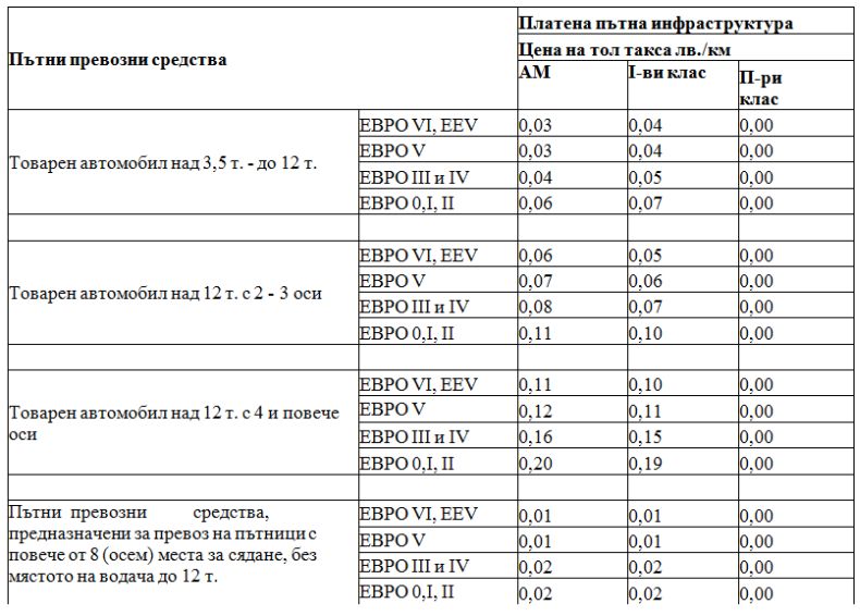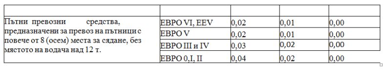 Автобусите с тегло до 12 тона, с емисионен клас Евро V, Евро VI или EEV ще плащат 1 ст. за автомагистрала и първи клас пътища, а тези с емисионен клас Евро IV, Евро III, Евро II, Евро I или Евро 0 - 2 ст. на километър за автомагистрали и първи клас пътища.