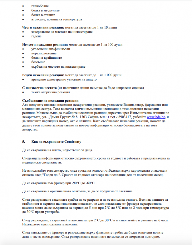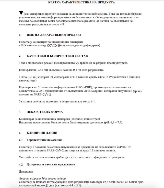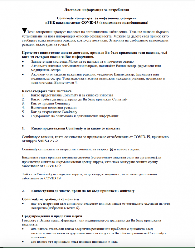 Здравното министерство разпространи на сайта си продуктова информация за Comirnaty концентрат за инжекционна дисперсия и РНК ваксина срещу COVID-19 (нуклеозидно модифицирана).