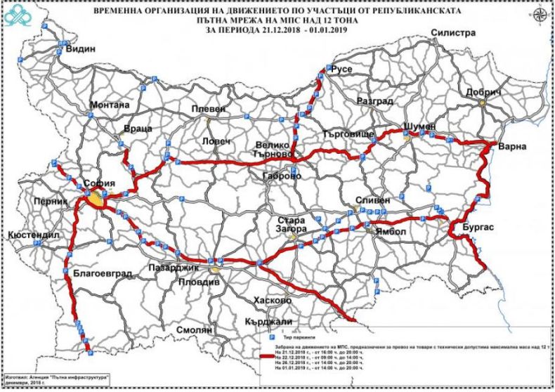 Утре - 26 декември, от 14.00 ч. до 20.00 ч. се ограничава движението на камионите над 12 тона по автомагистралите и най-натоваренитe пътища. Целта е повишаване на безопасността и увеличаване на пропускателната способност на инфраструктурата в края на петте почивни дни за Коледа, съобщават от АПИ.